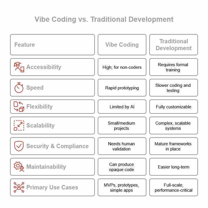 Thus, vibe coding currently complements rather than replaces traditional development methods, especially in mission-critical or enterprise-grade software.