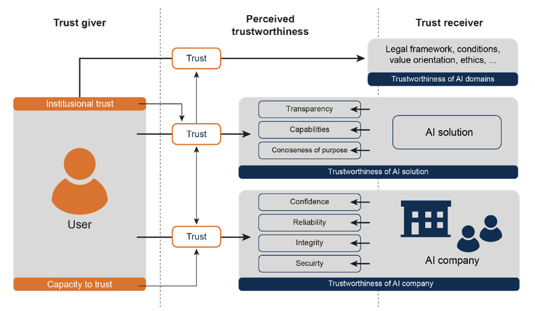 But when deciding to use new IT technologies, aspects of the respective AI solution are not the only decisive factors. On the contrary: the AI company’s reputation also plays an important role here. Since it is currently apparent that trust in IT technologies, applications, and services is in principle not (yet) fully justified, it is necessary for companies to fulfill additional conditions to increase their level of trustworthiness. To this end, AI companies must make their strategy visible to the outside world. In implementation, this means aligning their actions with the defined criteria of confidence, reliability, integrity, and security. The decisive factor for the definition is that it is possible to rationally assess the company-specific trustworthiness, to make it possible for the user to evaluate the corresponding parameters quickly and easily.