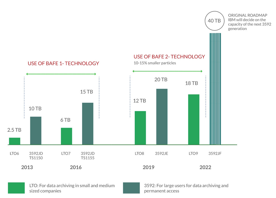 Fujifilm and IBM recently set a world record using Strontium Ferrite by demonstrating that it is possible to produce tapes with a capacity of 580 TB per cartridge.